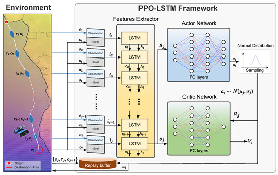 As shown in Figure 4, the PPO-LSTM architecture consists of several key components: an integrated feature extraction and state representation module, which processes the concatenated sensory observation and goal through LSTM networks, where the hidden states serve as representations of the underlying POMDP state , while the cell states reflect long-term dependencies; actor and critic networks that utilize the LSTM’s hidden states to incorporate temporal context and make decisions; and a replay buffer that stores experiences for training.