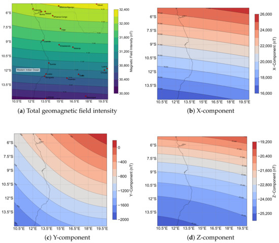 Geomagnetic field distribution over the simulation region (5° S–15° S, 10° E–20° E). (a) Total field intensity derived from the IGRF-14 geomagnetic model (EPSG:32333), with key cities and geographical features annotated. (b) Spatial distribution of the X-component. (c) Spatial distribution of the Y-component. (d) Spatial distribution of the Z-component.