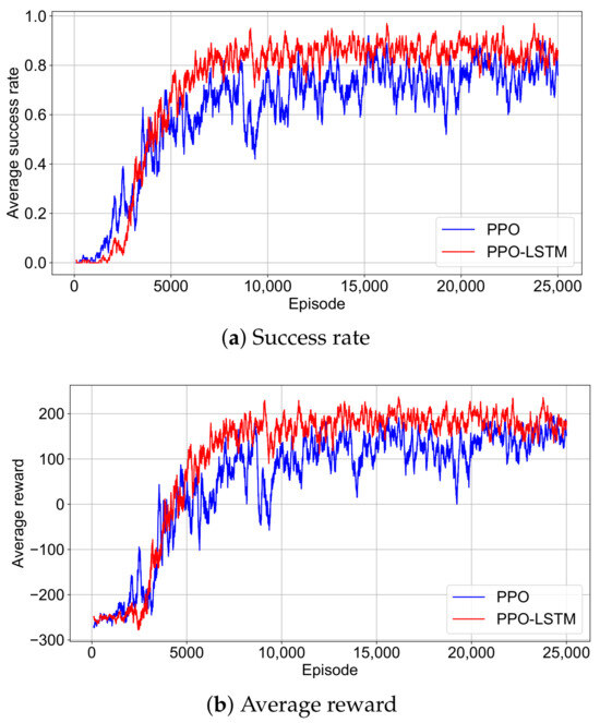 The success rate of PPO increases more gradually and exhibits noticeable oscillations, indicating less consistent progress without temporal memory. Its reward curve similarly shows a slower, fluctuating rise, only approaching PPO-LSTM’s level after 20,000 episodes, with greater variability even late in training. This suggests that PPO’s policy optimization is less efficient and more unstable compared to PPO-LSTM’s smoother convergence.