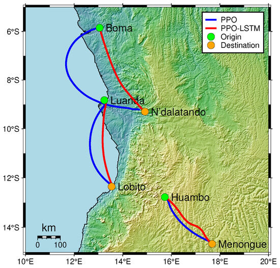 The trajectories illustrated in Figure 7 reveal a clear performance distinction between the standard PPO and the PPO-LSTM models across all three navigation tasks. The PPO-LSTM model consistently produced more direct paths compared to the standard PPO. For example, in the Luanda to Lobito task, PPO-LSTM maintained a nearly straight trajectory, while PPO showed noticeable deviations. Similarly, in the Boma to N’dalatando task, PPO-LSTM navigated with greater stability, whereas PPO exhibited larger detours. Even in the shorter task from Huambo to Menongue, PPO-LSTM exhibited oscillations but still outperformed PPO.