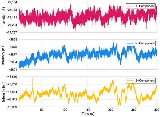 Time-domain waveforms of three-axis magnetic field intensities measured by the RM3100 magnetometer over a 300 s period at a 100 Hz sampling rate.