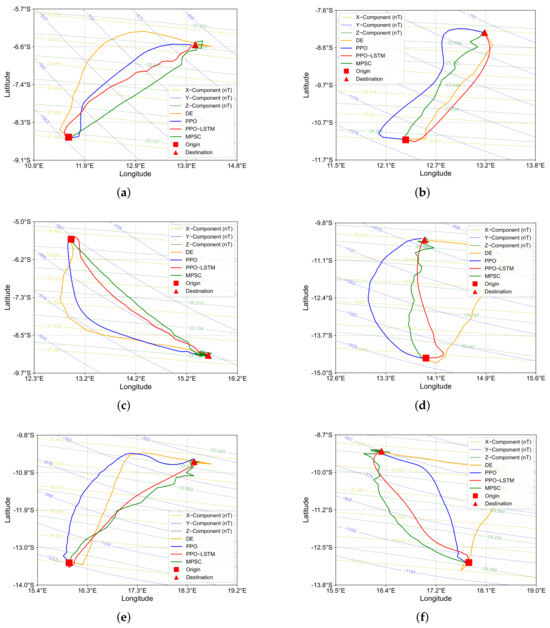 As two established approaches in bionic geomagnetic navigation, MPSC and DE contrast with the novel reinforcement learning framework introduced by PPO-LSTM. MPSC exhibits markedly higher heading deviation. Theoretically, MPSC demonstrates higher efficiency when the geomagnetic field’s contour lines exhibit high linearity, as its gradient-based approach aligns effectively with straight-line gradients. However, in regions where the contour lines are curved, MPSC’s fixed step length and gradient-based mechanism lacks the adaptability of reinforcement learning algorithms like PPO-LSTM and PPO, hampering its ability to refine navigation near the target and often leading to overshooting or oscillatory behavior around the goal, as observed in Tasks 3 and 6.