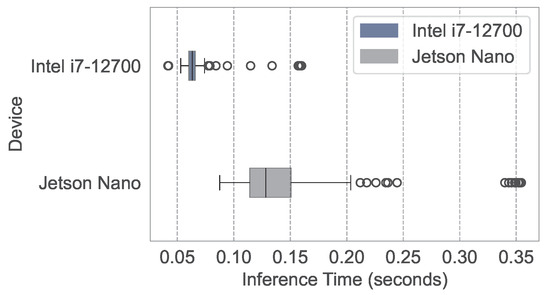 To evaluate the practical feasibility of the PPO-LSTM algorithm, we assessed its computational performance by implementing it on two distinct platforms: a high-performance laptop equipped with an Intel i7-12700 processor and an NVIDIA Jetson device. The Jetson, previously integrated into the ROV platform as shown in Figure 8, was removed for this experiment to independently verify the proposed navigation algorithm’s efficiency on resource-constrained edge devices, with the standalone setup illustrated in Figure 11. The box plot, presented in Figure 12, serves as a graphical representation of the computation times across these devices. The data was collected by executing the algorithm over 200 identical navigation tasks on each platform.