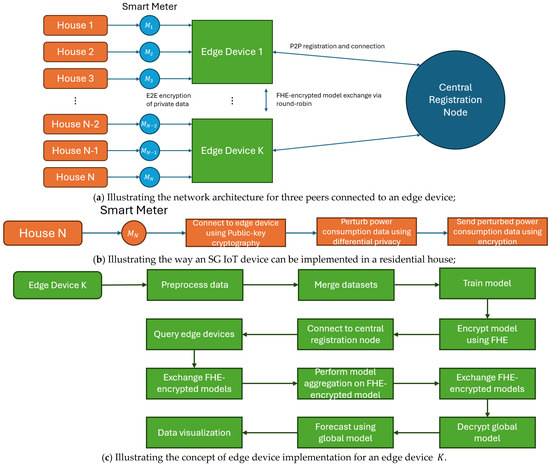 As more manual processes continue to be digitized within this domain, the use of data to make informed decisions through data-driven decision-making has become increasingly prevalent. However, this shift towards digitization and data reliance also introduces significant challenges, particularly data security and user privacy. For example, the detailed energy consumption data collected by smart meters can reveal intimate details about an individual’s lifestyle, habits, and daily routines [7,8,9]. This raises serious privacy concerns, as unauthorized access to such data could lead to misuse or exploitation. Moreover, the aggregation and analysis of such data on centralized servers create vulnerabilities, as these servers become attractive targets for cyberattacks, such as Distributed Denial of Service (DDoS) attacks or data breaches [10]. To address these challenges, there is a growing need for robust privacy-preserving techniques that can safeguard user data while still enabling the benefits of data-driven energy management. One such technique is HE, a cryptographic method that allows computations to be performed on encrypted data without the need for decryption [4,5,11]. This unique property of HE ensures that sensitive information remains secure throughout the data processing pipeline, making it particularly well-suited for applications in FL. By integrating HE into FL frameworks, it is possible to perform secure model aggregation and training without exposing raw data, thereby preserving user privacy while still achieving accurate and reliable predictions [12]. To build on the privacy preservation feature that FL offers, we introduce HE, a novel encryption scheme that behaves similarly to other encryption schemes, incorporating a key generation function, an encryption function, a decryption function, and an evaluation function as one of the core components of the FL framework [13]. The novelty in HE is that it allows the data to be manipulated while in an encrypted state, which means that the data is never exposed in a decrypted state, thus preserving the privacy and integrity of security of the data during the model aggregation process [13]. We include HE to improve the aspect of privacy preservation that P2PFL offers by incorporating it into model aggregation for federated energy consumption prediction models. Therefore, this paper aims to develop a novel IoT framework utilizing a combination of FL, Edge Computing (EC), and HE principles with the goal of predicting energy consumption patterns in an SG system while preserving user privacy End-to-End (E2E).