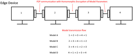 Once all the tensors representing the model parameters have been encrypted, we can then transmit these now encrypted tensors in a round-robin fashion to each peer within the P2P network and perform aggregation via the FedAvg algorithm with a different approach [17]. We first perform addition of each peer’s local model parameters with the encrypted tensors (using Equation (3)) representing a certain peer’s local model parameters, with each peer passing the encrypted model forward to another peer in round-robin fashion (see Figure 2) until the encrypted model returns to the initial peer that made an aggregation request in the network. The initial peer can then decrypt the encrypted model, where represents the sum of all peer model parameters in a decrypted state, which will now contain tensors which represent the sum of all model parameters in the P2P network. We then divide each of these tensors by the number of additional operations performed (see Equation (4)) on the encrypted tensors to determine the global FL model without the risk of model data leakage occurring at any stage in the aggregation process within the network while the model is in possession by a different peer. This process is repeated on each peer within the network, allowing each peer to derive the same global model while maintaining both security and privacy within the network.