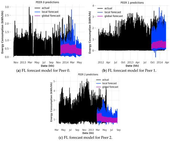 One can observe that the FL model can predict power consumption trends to some accuracy, depending on the client that it is running, compared to the local forecast model (similar trends and patterns depending on the date) (see Figure 3).