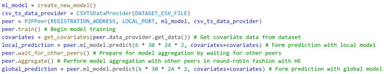 An example of algorithmic code utilizing P2P is shown in Figure 4. To demonstrate using the framework to train an FL model among numerous peers sharing a CRN using a P2P architecture. In this example, the CSV file is provided as the first parameter through the command line when executing the example program. The P2PPeer ‘start’ function is then called, which registers the peer to the provided registration server at REGISTRATION_ADDRESS with the port LOCAL_PORT for other peers to connect to via the registration server. The peer then performs local model training using the dataset provided, generating a prediction using the locally trained model, and then waits for other peers to do the same via the registration server using the wait_for_other_peers function. Once the wait_for_other_peers function returns, indicating that all other connected peers have performed local model training, all connected peers then individually perform global model aggregation and distribution via the aggregate function. Once the global model has been finalized, the program generates another prediction using the global model.