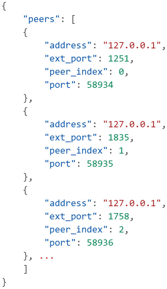 We observe that the framework can successfully compute an FL model from 100 separate ML models running on separate instances communicating through the previously established P2P architecture (see Figure 6). The CRN registers each peer’s address and port from which a connection was established and receives the communication port from the client itself. Additionally, the CRN determines each peer’s index relative to each other to streamline the model aggregation process later. Because the P2P architecture does not require much information to establish, we eliminate any personally identifiable information that can be used to connect a client to a data source, thus preserving user privacy. The average runtime per peer is 25 s, with 0.08% of that time spent on performing CKKS FHE, and 82.66% of that time being spent on training local models, leaving 17.26% of that time being spent on model aggregation and prediction.