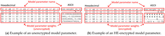 A comparison of the unencrypted local client model (a) and the HE-encrypted client model (b) that is distributed to other P2P clients for FL model aggregation.