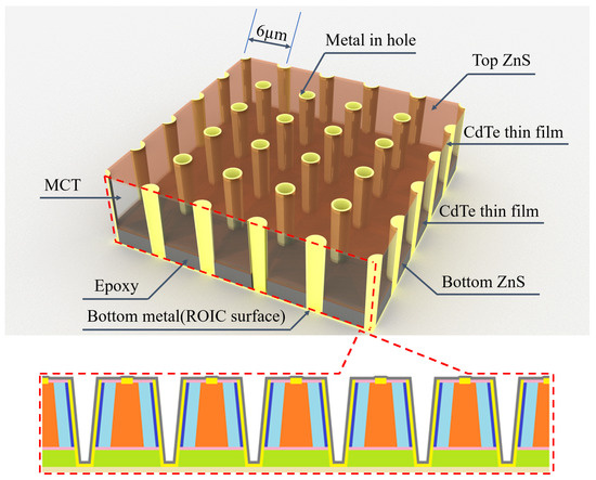The HDVIP was developed at Leonardo DRS. The monocular HDVIPTM structure prepared by DRS is shown in Figure 1 [2]. Detector and multiplexers are glued together, and their electrical interconnection is made through a small hole formed in each detector. DRS Network and Imaging Systems has developed ultra-small 5 µm pitch infrared detectors for the long-wave infrared (LWIR) and medium-wave infrared (MWIR) bands as part of the Defense Advanced Research Projects Agency—Alert Warefighter Enablement (DARPA AWARE) Lambda scale effort [3]. They show LWIR FPAs operating at 77 K collected 45–55% of the incident photons, and the collection efficiency could be increased by using a thicker Hg1−xCdxTe layer [3]. However, the hole etching process limits the thickness of Hg1−xCdxTe because of the via’s aspect ratio. Therefore, it is crucial to explore alternative methods to enhance absorption.