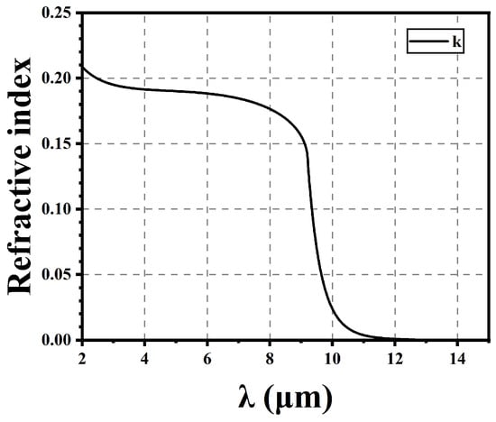 According to the formula in Section 2, we calculated the refractive index of Hg1−xCdxTe (x = 0.225); the refractive index of the real part is approximately 3.52. Figure 4 shows the imaginary part of the refractive index for Hg1−xCdxTe, and 10.08 µm is the cutoff wavelength. Actual samples will decrease in absorption more slowly at the cutoff wavelength, and some formula correction methods have struggled to achieve a very good fit [16,17,18,19].