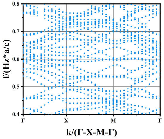 Subsequently, a simple 2D-PhC slab model with Radius = 1.5 µm was implemented. The photonic band structure (TE mode) was computed for this configuration. The model is depicted in Figure 5b. The simulation is built by sweeping multiple k-points through the Brillouin zone of a square lattice (a = period, which is 6 µm). As shown in Figure 7, for each considered k-point, frequencies supporting guided modes for resonance (GMRs) will propagate indefinitely, while all other frequencies dissipate rapidly.