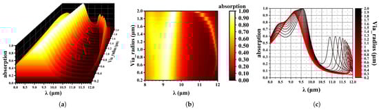 Effect of via radius on wave absorption. (a) 3D data mapping chart; (b) Contour plot, x is wavelength, y is via radius; (c) The absorption spectrum varies with changes in via, from 0.2 µm to 2.0 µm.