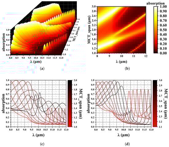 Effect of MCT thickness on wave absorption. (a) 3D data mapping chart; (b) Contour plot, x is wavelength, y is MCT thickness; (c) The absorption spectrum varies with changes in MCT thickness, from 1.0 µm to 2.0 µm and (d) from 2.1 µm to 3.0 µm.