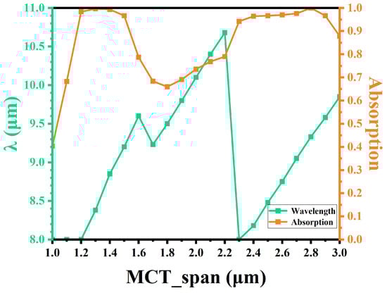 Table 3 shows the maximum absorption peak for various HgCdTe thicknesses. The absorption peak shift as a function of HgCdTe thickness is apparent. Figure 11 presents the maximum absorption value and wavelength versus HgCdTe thickness. For HgCdTe layers thinner than 1.3 µm, achieving an absorption approaching 100% becomes challenging due to the difficulty of resonance in such structures. The interference enhancement is determined by the optical path difference. Therefore, as the thickness of HgCdTe increases from 1.0 µm to 3.0 µm, the interference conditions are again satisfied in the original wavelength range.
