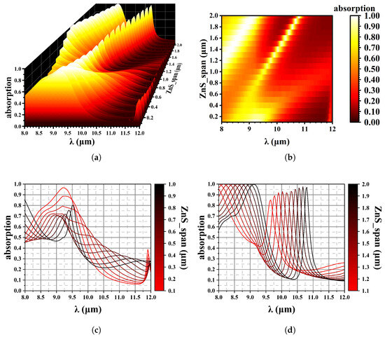 As illustrated in Figure 12, the thickness of the ZnS layer on the surface affects the optical path of the whole material. The ZnS material is only used as a control of the peak position. Figure 12c is the spectrum of 0.1–1.0 µm thick ZnS, and Figure 12d is 1.0–2.0 µm thick ZnS. An increase in the thickness of ZnS results in a shift of the absorption peaks towards longer wavelengths, with a spectral shift of 1.41 µm/(1 µm ZnS). Consequently, by adjusting the thickness during fabrication, we can achieve the desired absorption spectra for practical applications.