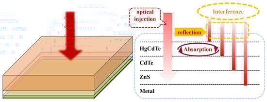 Figure 10 illustrates reflection spectroscopy within the wavelength range of 8–12 µm. To achieve more than 95 % absorption at 8–9 µm, we can choose 1.1–1.4 µm or 2.2–2.6 µm thick HgCdTe, as shown in Figure 10b. The configuration used in this simulation is shown in Table 2. As the HgCdTe thickness increases from 1.0 µm to 3.0 µm, two distinct phenomena are observed: