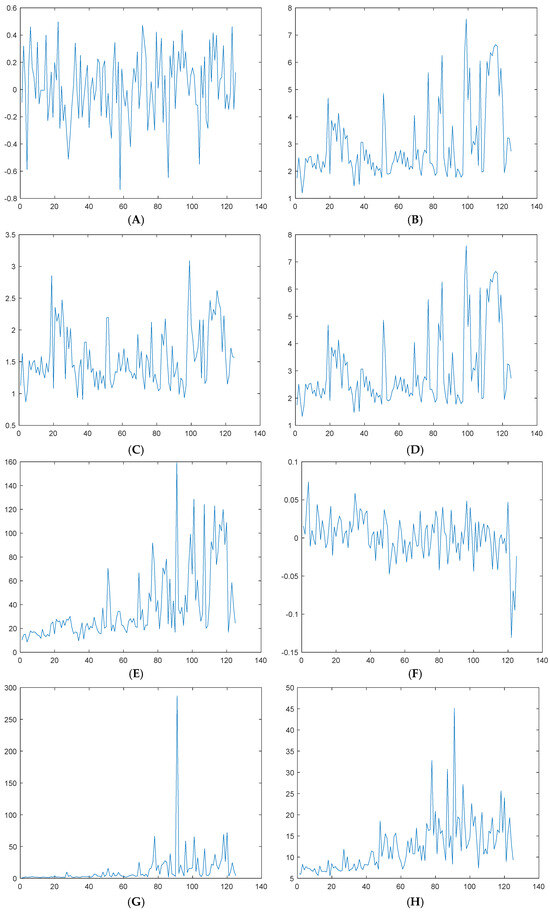 We calculated the mean value, standard deviation, root mean square amplitude, root mean square, peak-to-peak value, skewness, kurtosis, peak factor, margin factor, form factor, impulse index, etc. of each segment of the vibration signal in the time domain. The obtained results are shown in Figure 12; the vertical axis in the figure represents the characteristic parameters and the horizontal axis represents the number of data groups.