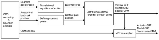 Computational flow for estimation of ground reaction forces (GRFs) and moments (GRMs). The vertical GRF and frontal and sagittal GRMs are calculated by distributing the external force to each contact point defined on the foot segment. The horizontal GRFs and transverse GRM are then calculated based on the assumption that the GRF vector intersects the virtual pivot point (VPP) on the human body.
