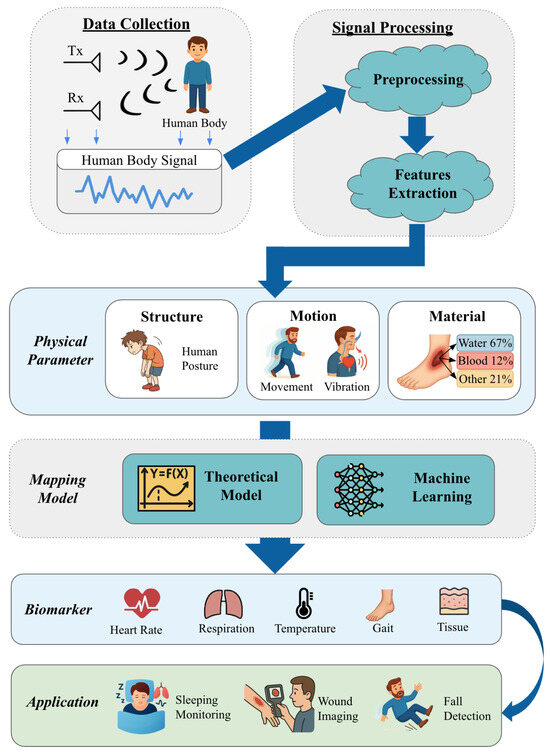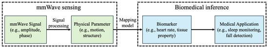 mmWave technology provides high-resolution, non-invasive methods for monitoring and diagnosing physiological conditions. As shown in Figure 2, a typical mmWave-based medical system includes system hardware, signal preprocessing, physical parameter extraction, parameter–biomarker mapping, and validation processes.