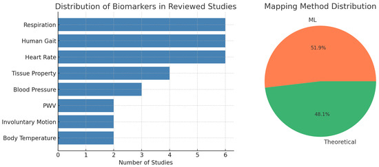 Summary statistics of 27 representative mmWave medical studies. (Left) Frequency of targeted biomedical biomarkers. (Right) Proportion of studies using theoretical vs. machine learning (ML)-based mapping models.