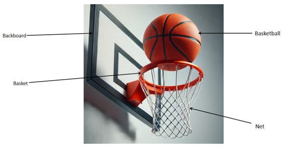 Shooting plays a crucial role in basketball, and real-time feedback on successful shooting is crucial for both players and coaches [9]. Shooting is the only way to score in basketball games [10]. Basketball shooting refers to all movements that push the basketball towards the basket and is one of the most complex technical movements. The purpose of all tactical applications is to create more and better shooting opportunities and to strive to score through shooting. Previous research has mainly focused on the implementation of wearable devices and the recording of video inputs [11]. However, these methods often overlook information collected from baskets, backboards, and nets. When a basketball is thrown, the ball interacts with the basket, which is manifested as the shaking of the frame and net, caused by rebounds and different shot types. The vibrations of the goal components caused by different types of goals differ [12,13,14,15]. Through extensive literature review and research, each stroke of the ball was found to produce a brief shake of the net until it stabilized in a stationary position [16,17]. The time required to reach a stable position depends on the intensity and smoothness of the vibration. In addition, the success of shooting is highly correlated with jitter data [18]. To demonstrate the connection between goals and goal components, this study proposes a new method that includes an analysis of the basketball, backboards, and nets. By collecting and analyzing data on these factors, a more comprehensive understanding of players’ shooting skills and their impact on shooting success can be acquired. This method considers not only the interaction between the ball and the basket but also the role of the backboards and net in determining the shooting result. The relationship between the backboard, basket, and basketball in the experiment is shown in Figure 1.