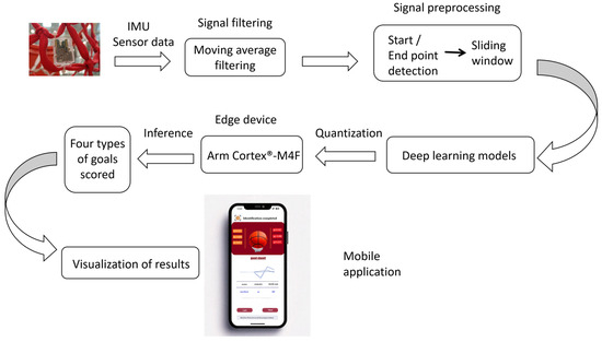 As shown in Figure 2, the system is divided into four key functional modules: data acquisition, signal filtering, signal preprocessing, and deep learning model recognition. When the basketball enters the hoop and interacts with the net, the IMU sensor collects real-time vibration data from the net. The data are transmitted to the Arm Cortex®-M4F STM32L476 microcontroller for real-time edge processing.