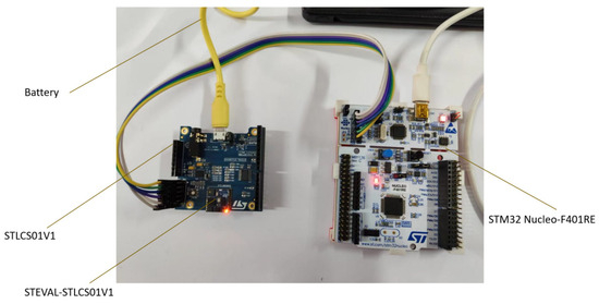 The STM32L476 MCU is a mid-range model of the STM32L4 series, characterized by its ultralow-power single-chip architecture, which is suitable for edge computing applications. It runs on an ARM Cortex M4F core with a frequency of 80 MHz, integrating a hardware floating-point unit (FPU) and a digital signal processing (DSP) instruction set, and has 1024 kB program memory (flash) and 128 kB RAM. To develop the STM32L476 microcontroller, we used the expansion board in the Sensor Tile development kit STEVAL-STLKT01V1, which supports a USB connection and power supply. ST-Link V2 (STMicroelectronics, Geneva, Switzerland) on the NucleoSTM32L476 (STMicroelectronics, Geneva, Switzerland) board was used for device burning and debugging operations to ensure the efficiency and stability of system development and debugging. The entire setup is shown in Figure 4.