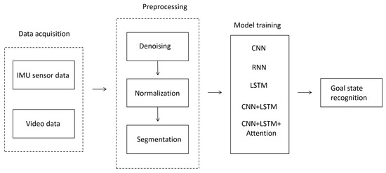 This flowchart shows the processing flow of goal state recognition, including four steps: data collection, preprocessing, deep learning model processing, and recognition output. After data collection, preprocessing, such as noise reduction, normalization, and segmentation, was performed, analyzing the results using a deep learning model to identify the goal types (see Figure 5).