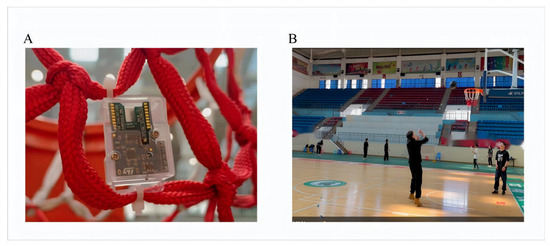 The core system of the Sensor Tile development board (including the support board and battery) was welded and encapsulated in a plastic housing. The assembly was firmly placed outside the lower end of the basketball net. The equipment was firmly fixed in the same position throughout the data collection phase to ensure consistency and accuracy. The experimental setup is shown in Figure 6A. The sensors continuously recorded acceleration and angular velocity values along the x-, y-, and z-axes, capturing the key moments of the basketball’s interaction with the goal.