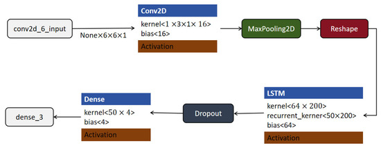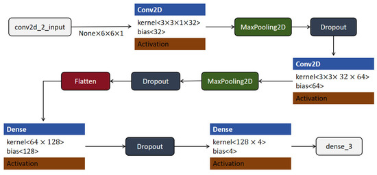 The CNN model used in this experiment was specifically designed to recognize shooting actions. Deep learning techniques were leveraged to automatically extract and learn critical features from input data. The model architecture is shown in Figure 8. The process begins with the input layer, which accepts grayscale image data with a shape of (None, 6, 6, 1), where “None” represents the batch size. The input is passed to the first convolutional layer (Conv2D), which applies 32 filters of size 3 × 3, generating a feature map of shape (None, 4, 4, 32). This feature map is then passed through a MaxPooling2D layer, which performs downsampling and reduces the spatial dimensions to (None, 2, 2, 32), lowering computational cost and helping to prevent overfitting. A dropout layer follows, with the same output shape.