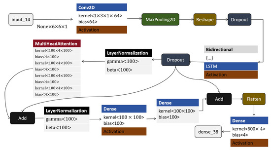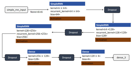 The structure of the RNN model is illustrated in Figure 9. The model begins with an input layer that accepts time-series data with a shape of (None, 6, 6), where each sample contains a sequence of six time steps with six features per step. The input is first processed by a SimpleRNN layer with 64 units. This layer uses a kernel of shape (6 × 64) and a recurrent kernel of shape (64 × 64), outputting a sequence with shape (None, 6, 64). A dropout layer is then applied to the output to reduce overfitting and improve generalization. The next SimpleRNN layer increases the feature dimensionality to 128, using a kernel of shape (64 × 128) and a recurrent kernel of shape (128 × 128). This is followed by another dropout layer. The sequence then passes through a third SimpleRNN layer with 256 units, which further captures temporal dependencies. This layer is followed by a third dropout layer for regularization. The RNN output is then passed to a fully connected (Dense) layer with 128 units and an activation function, followed by a dropout layer. Finally, the model outputs predictions through another dense layer with 4 units, corresponding to the four classification categories. The output layer uses a softmax activation function to generate class probabilities, while all intermediate layers apply the ReLU activation function.