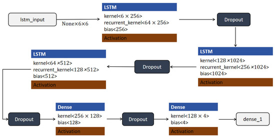 In this experiment, the LSTM model was applied to basketball goal state recognition, enabling the system to accurately process and classify goal states. The model structure is shown in Figure 10. The model begins with an input layer, “lstm_input”, which receives sequential data of shape (None, 6, 6), where each sample contains six time steps with six features per step. The first LSTM layer processes this input and maps it to a higher-dimensional space using a kernel of shape (6 × 256) and a recurrent kernel of shape (64 × 256), producing an output of shape (None, 6, 256). To prevent overfitting and improve generalization, a dropout layer is applied to the output of this LSTM layer. The subsequent LSTM layer increases the output dimensionality to 1024 units, with a kernel of shape (128 × 1024) and a recurrent kernel of shape (256 × 1024). A second dropout layer follows this to enhance regularization. The third LSTM layer further processes the sequence using 512 units and receives input from the previous layer, using a recurrent kernel of shape (128 × 512). This layer captures deeper temporal dependencies within the data and is followed by another dropout layer. The output is then passed to a fully connected (Dense) layer with 128 units, followed by a dropout layer for additional regularization. Finally, the processed feature representation is fed into another dense layer with 4 output units. This final layer uses a softmax activation function to produce a four-dimensional output vector, representing the predicted class probabilities for each goal state category.