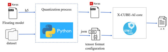 The STM32L476 microcontroller runs the API of the IMU sensors, which can control the operation of the sensor, configure the parameters, and read measurement data. STMicroelectronics X-Cube-AI (STMicroelectronics, Geneva, Switzerland) artificial intelligence kit was used to load the deep learning model trained on the PC server into STM32L476 and perform benchmark tests to achieve efficient real-time reasoning.