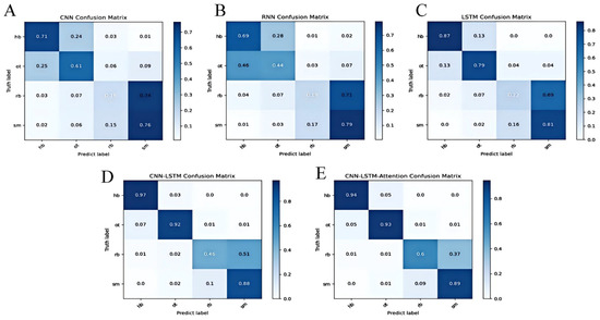 Confusion matrix comparison of five deep learning models: (A) CNN confusion matrix; (B) RNN confusion matrix; (C) LSTM confusion matrix; (D) CNN-LSTM confusion matrix; and (E) CNN-LSTM-Attention confusion matrix.