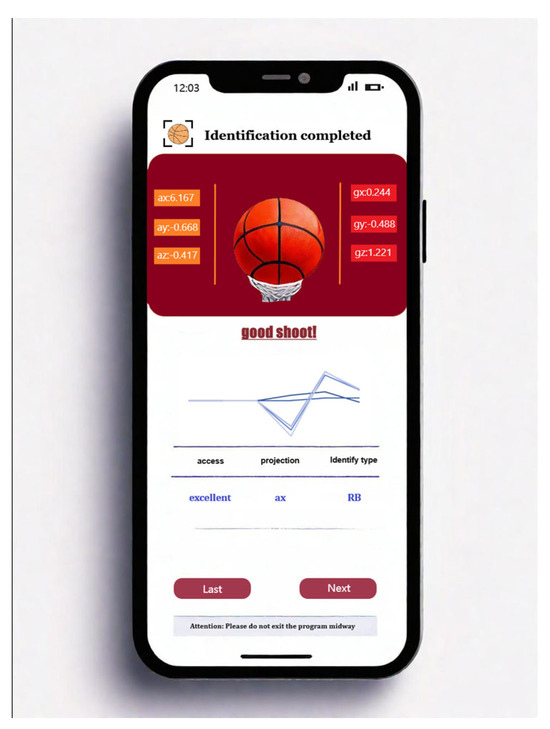 We developed a user-friendly smartphone application that enables users to visualize the real-time recognition results captured by the sensor, providing an intuitive and enhanced viewing experience. As shown in Figure 17, this interface provides a real-time assessment of the RB’s goal-scoring status, as well as the acceleration and angular velocity values of the three axes at the moment of the goal. This visualization function allows users to monitor and analyze their shooting results in real time and provides professional insights.