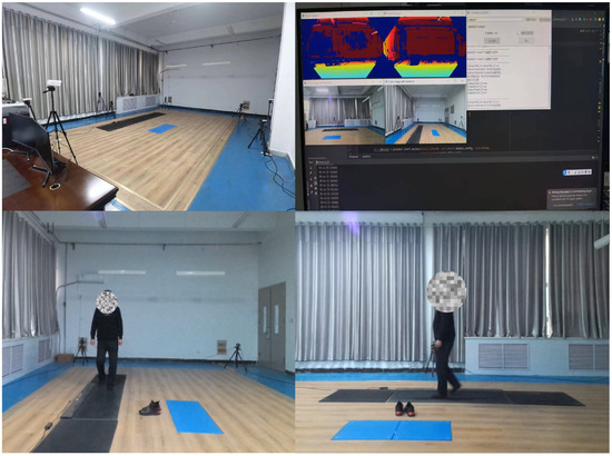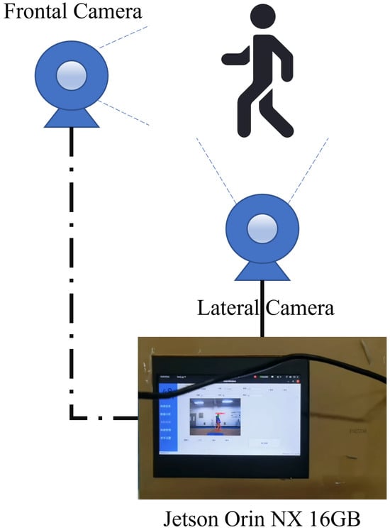 We used two camera sensors to synchronously record gait videos—one positioned frontally and the other laterally—with a resolution of 1080p at 30 frames per second. Each volunteer participated in approximately 5 min of gait recording and was instructed to walk back and forth within the camera sensor coverage area, with separate video recordings made at both 4 m and 2 m distances from the lateral camera sensor. Volunteers maintained a natural walking gait, walking straight and perpendicular to the frontal camera sensor, without running, jumping, or other unnatural walking behaviors. The data collection environment is shown in Figure 1.