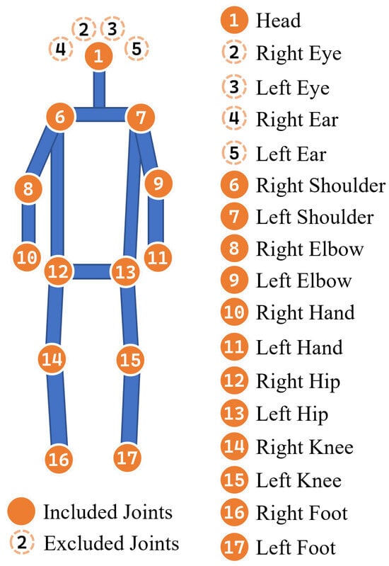 In gait detection research, converting human motion videos into skeletal joint representations is an effective method for data processing. These skeletal representations not only reduce data complexity but also preserve the essential motion patterns of the human body. We used YOLOv7-Pose [31] to process gait videos and obtain skeletal joint data, which included 17 joints, as shown in Figure 2. Non-essential joints, such as the eyes and ears, were excluded, yielding 13 joints for subsequent analysis.