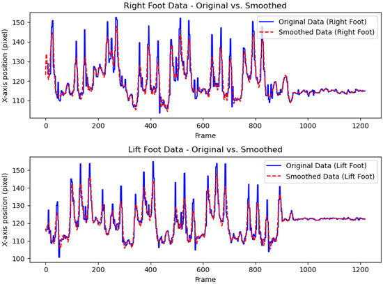 We developed a computational method that integrates Savitzky–Golay (SG) filtering [32] with a sliding window peak selection function to obtain segmentation frames. This method processes skeletal joint data, focusing on the lateral-view data in relation to the Y-axis positions of the left and right foot lift heights. The goal is to obtain the local minimum of the right foot’s Y-coordinate as the start frame and the left foot’s as the end frame.