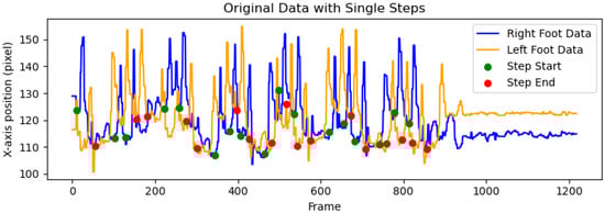 The processed skeletal joint data comprised continuous back-and-forth walking sequences with a relatively long duration, which could not be directly utilized for training and thus required appropriate preprocessing. Single-step sequencing effectively captures the gait pattern characteristics of different samples, making it an optimal input format. Moreover, automatically extracting single-step sequences from complex long videos aligns with the core research objective of device development, which emphasizes minimizing operational demands on users.