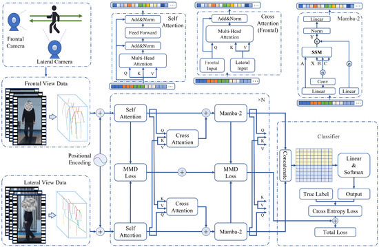 The overall pipeline of our proposed Cross-Attention Fusion with Mamba-2 and Self-Attention Network (CMSA-Net) is shown in Figure 5. The input consists of gait skeleton joint sequences captured from both frontal and lateral views. These two sequences are processed separately by identical networks composed of multiple layers of Self-Attention and Mamba-2 modules to extract their respective features.