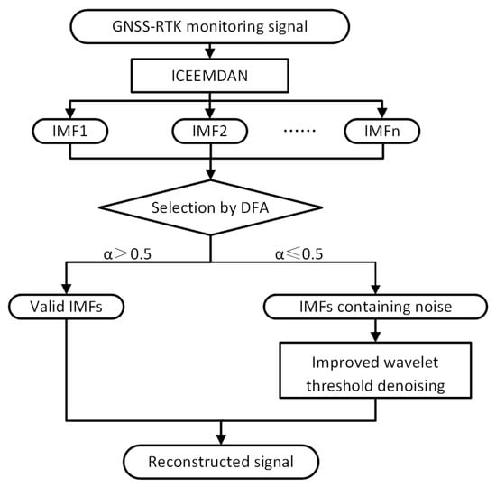 This study proposed an improved hybrid denoising method based on the GNSS-RTK sensor. This method was applied to bridge dynamic monitoring. First, the GNSS-RTK monitoring signal was decomposed into IMF components by ICEEMDAN. Then, DFA was used to identify whether the IMF components contained noise. If the IMF component contained noise, reduce noise using the improved wavelet threshold denoising method. Finally, the denoised IMF components and the valid IMF components were combined to reconstruct the monitoring signal. Figure 2 displays the proposed method’s flow.