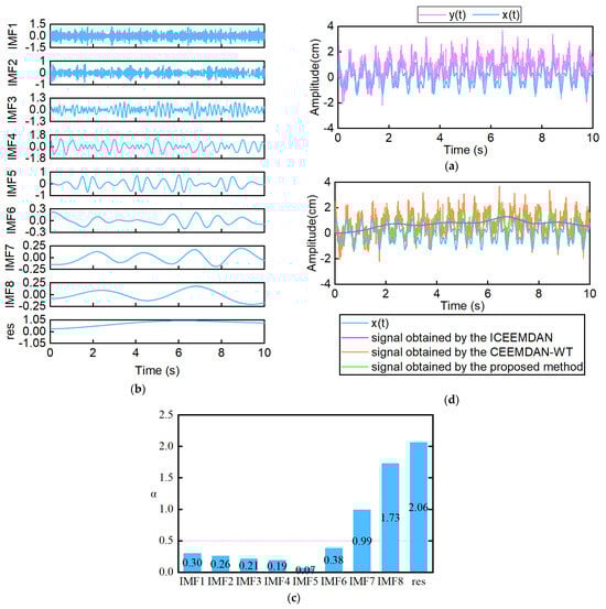 First, was decomposed into the IMF components and residual components using the ICEEMDAN method. Figure 3b displays the IMF components and a residual component. Then, DFA was used to identify the noisy component. As shown in Figure 3c, the indicator α of IMF1, IMF2, IMF3, IMF4, IMF5, and IMF6 is less than 0.5, and the others are larger than 0.5. It indicates that IMF1, IMF2, IMF3, IMF4, IMF5, and IMF6 contain noise, and others are valid components. A noisy signal was constructed with IMF1, IMF2, IMF3, IMF4, IMF5, and IMF6. Then, the noisy signal was denoised by the improved wavelet threshold denoising method. The signal obtained by the proposed method was constructed with the valid components and the denoised signal. In Table 1, the proposed method acquires lower RMSE and higher SNR than the ICEEMDAN method and the CEEMDAN-WT method. The signal obtained by the proposed method is more similar to the original signal , as shown in Figure 3d. It indicates the superiority of the proposed method.