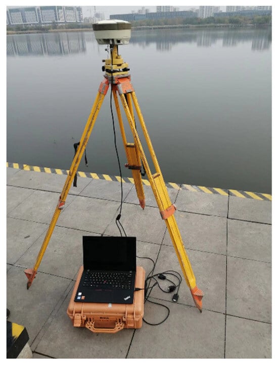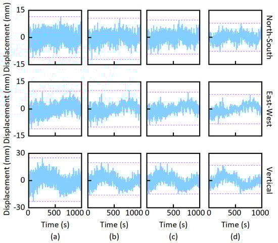 The GNSS-RTK stability experiment was conducted on stable ground near a river with two GNSS receivers. The plane positioning accuracy of the instruments was ±(1 cm + 1 ppm), and the elevation positioning accuracy was ±(2 cm + 1 ppm). This experiment applied GPS, GLONASS, and BDS. Figure 4 shows the rover station. Figure 5 shows the displacements, and the dashed lines mark the displacement range boundaries. The non-zero original displacements reveal the noise of GNSS-RTK. Figure 5d shows a lower displacement range than Figure 5b,c. It indicates that the improved threshold wavelet denoising method is superior to the traditional wavelet denoising methods in reducing GNSS-RTK noise.