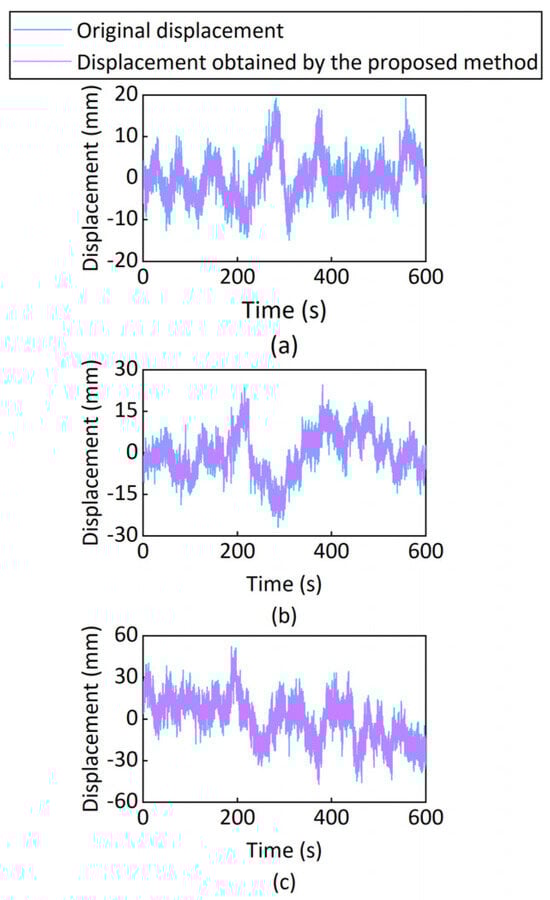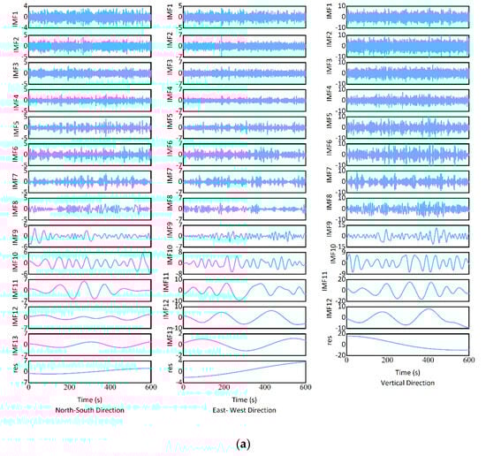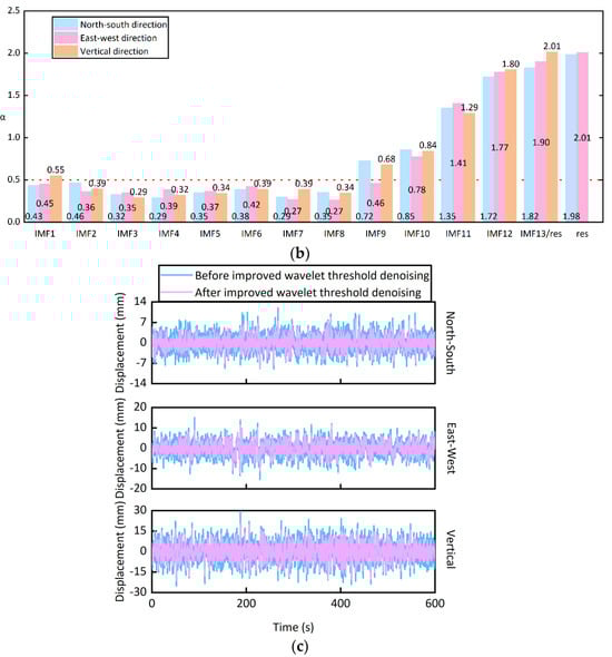 Figure 7 and Table 2 show the displacements of the monitoring point. First, ICEEMDAN decomposed the original displacement into the IMF components and residual components. The standard deviation of the Gaussian noise affects the accuracy of signal decomposition. Setting too high may introduce too much noise, while setting too low may not have enough effect on the noise. Increasing the number of noise additions can improve the consistency of results, but it will increase computation time. If the number of iterations is too small, it may not be possible to obtain a good IMF, and if it is too large, it may lead to excessively long computation time. Considering the above, the parameters for ICEEMDAN were the standard deviation of the Gaussian noise was 0.2; the number of noise additions was 50; the maximum number of iterations was 100. Figure 8a displays the IMF components and residual components. Then, DFA was used to identify the noisy component. The size of the windows at which to evaluate the fluctuation was 50. As shown in Figure 8b, IMF2, IMF3, IMF4, IMF5, IMF6, IMF7, and IMF8 contain noise, where indicator α is less than 0.5. In addition, IMF1 in the north–south direction and east–west direction, as well as IMF9 in the east–west direction, contain noise, where the indicator α is also less than 0.5. The noisy signals were constructed using the IMF components containing noise. The noisy signals were reduced using the improved wavelet threshold denoising method. The wavelet type was db8, decomposition level was 4. As shown in Figure 8c, the improved wavelet threshold denoising method can effectively reduce the noise and retain useful information. At last, the signals were reconstructed. To obtain the north–south displacement signal, the denoised signal was recombined with IMF9, IMF10, IMF11, IMF12, IMF13, and the residual component. To obtain the east–west displacement signal, the denoised signal was recombined with IMF10, IMF11, IMF12, IMF13, and the residual component. To obtain the vertical displacement signal, the denoised signal was recombined with IMF1, IMF9, IMF10, IMF11, IMF12, and the residual component. As shown in Table 2, the proposed method produces a narrower displacement range compared to the original displacements. Figure 7 displays the displacement signal treated by the proposed approach, which reduced the noise while retaining the primary signal. It indicates the proposed method is efficient at reducing GNSS-RTK monitoring noise. In addition, Figure 7 and Table 2 show that the bridge’s vertical dynamic displacements were larger than its planar dynamic displacements.