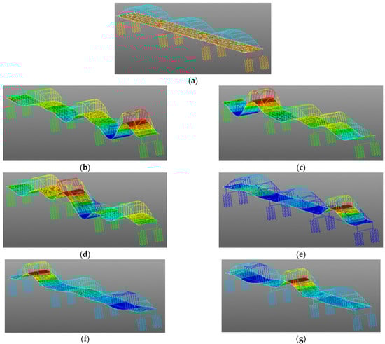 The FEA of Rainbow Bridge. (a) Finite element analysis model. (b) The first order of the mode shape. (c) The second order of the mode shape. (d) The third order of the mode shape. (e) The fourth order of the mode shape. (f) The fifth order of the mode shape. (g) The sixth order of the mode shape. (Red, yellow, green, blue and the colors from dark to light indicate the amplitude of the displacement from strong to weak.)
