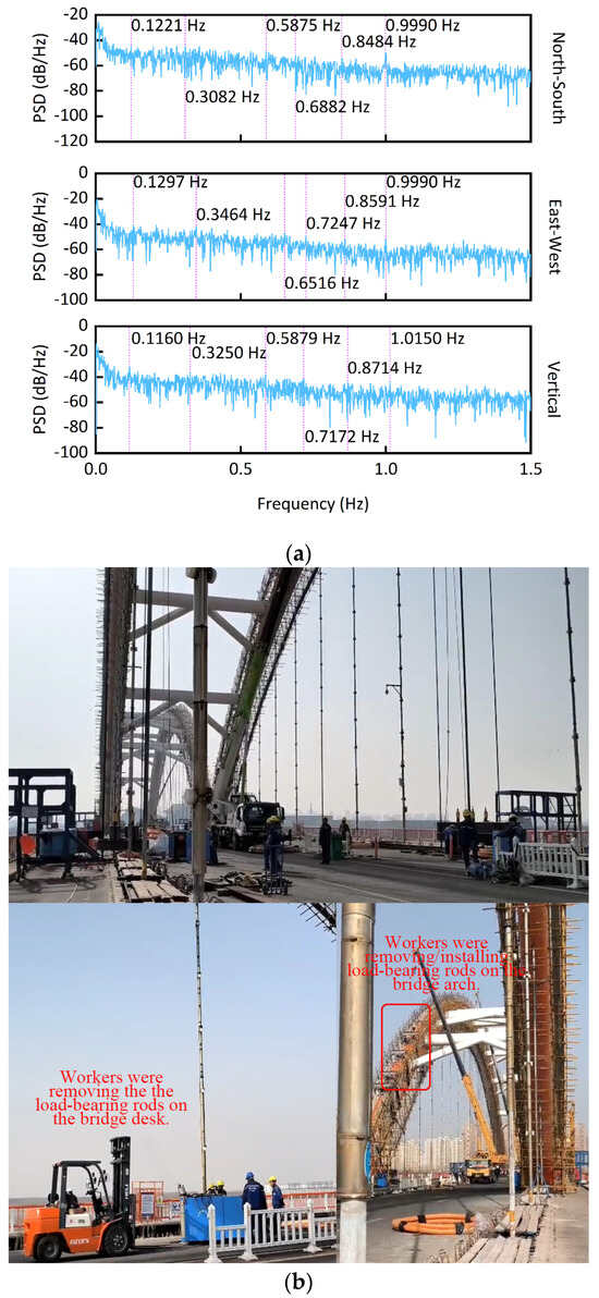 Figure 10b shows the construction site. Large construction machines worked on the bridge, some load-bearing rods were placed on the bridge, and workers were removing and installing load-bearing rods on the arches and decks of the bridge. These situations could not appear when the bridge is in normal condition. The complex construction situations significantly affect the bridge’s mechanical system. The process of removing and installing load-bearing rods is a process of destroying the bridge’s old load-bearing system and rebuilding a new load-bearing system. This process caused the bridge’s mechanical system to constantly change, and the bridge’s natural frequencies changed in tandem.