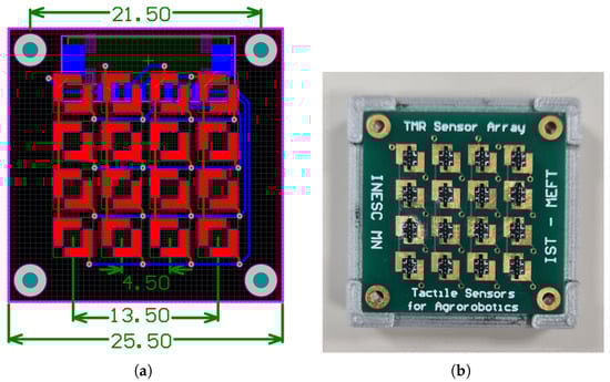 (a) Layout view of the PCB with the ‘L’ pads for the TMR sensors. The relevant dimensions are presented in millimeters. (b) Picture of the PCB with the TMR sensors.