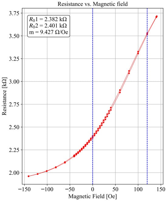 Example of sensor resistance measured across the + and − terminals as a function of an external magnetic field. The individual magnetic field strength values that were employed are shown as red dots (the line connecting them is merely illustrative). The nominal resistance values at a zero field, , and are obtained, as well as the sensor’s sensitivity m, calculated for the linear region [0, 120] Oe (highlighted in blue). The maximum hysteresis is 1.5 Oe.