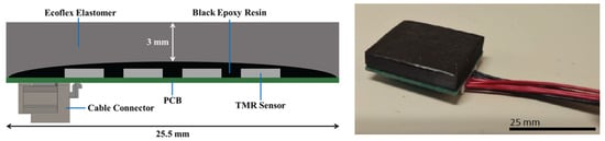 On the left: Schematic cross-section of the tactile sensor module, including 16 magnetoresistive sensor chips encapsulated with epoxy and buried underneath a 3 mm thick Ecoflex skin. On the right: Photograph of the integrated device.